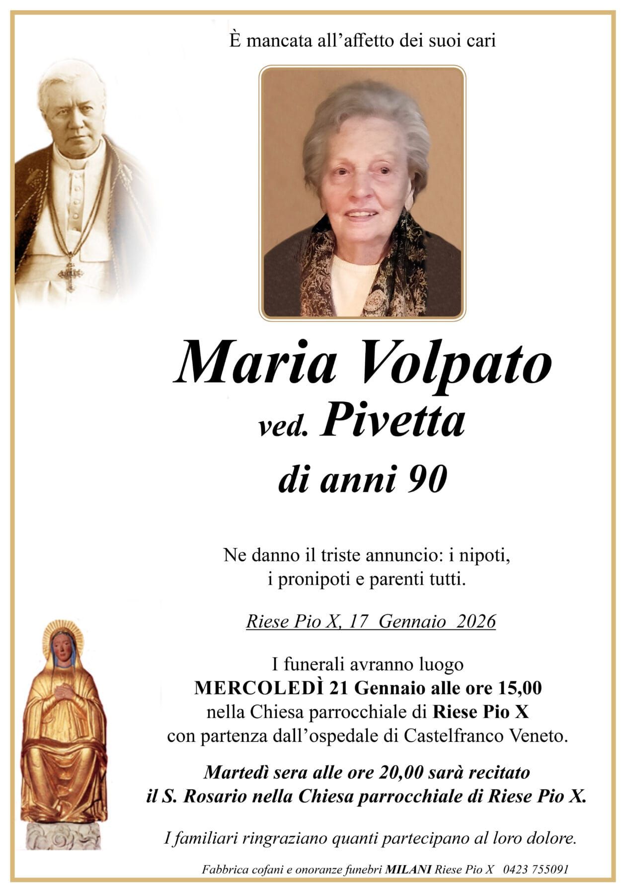 Il rosario sarà recitato Martedì 20 Gennaio 2026 alle ore 20:00 nella Chiesa Parrocchiale di Riese Pio X.