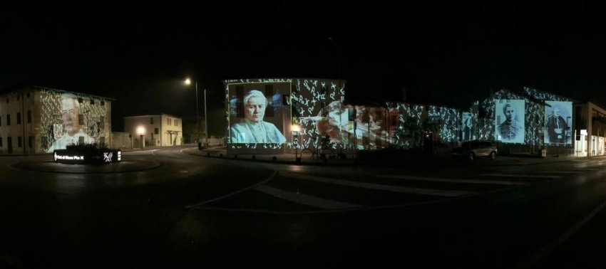 Immagini di S Pio X proiettate sulle facciate delle case durante i pellegrinaggi serali 'aux flambeaux'.